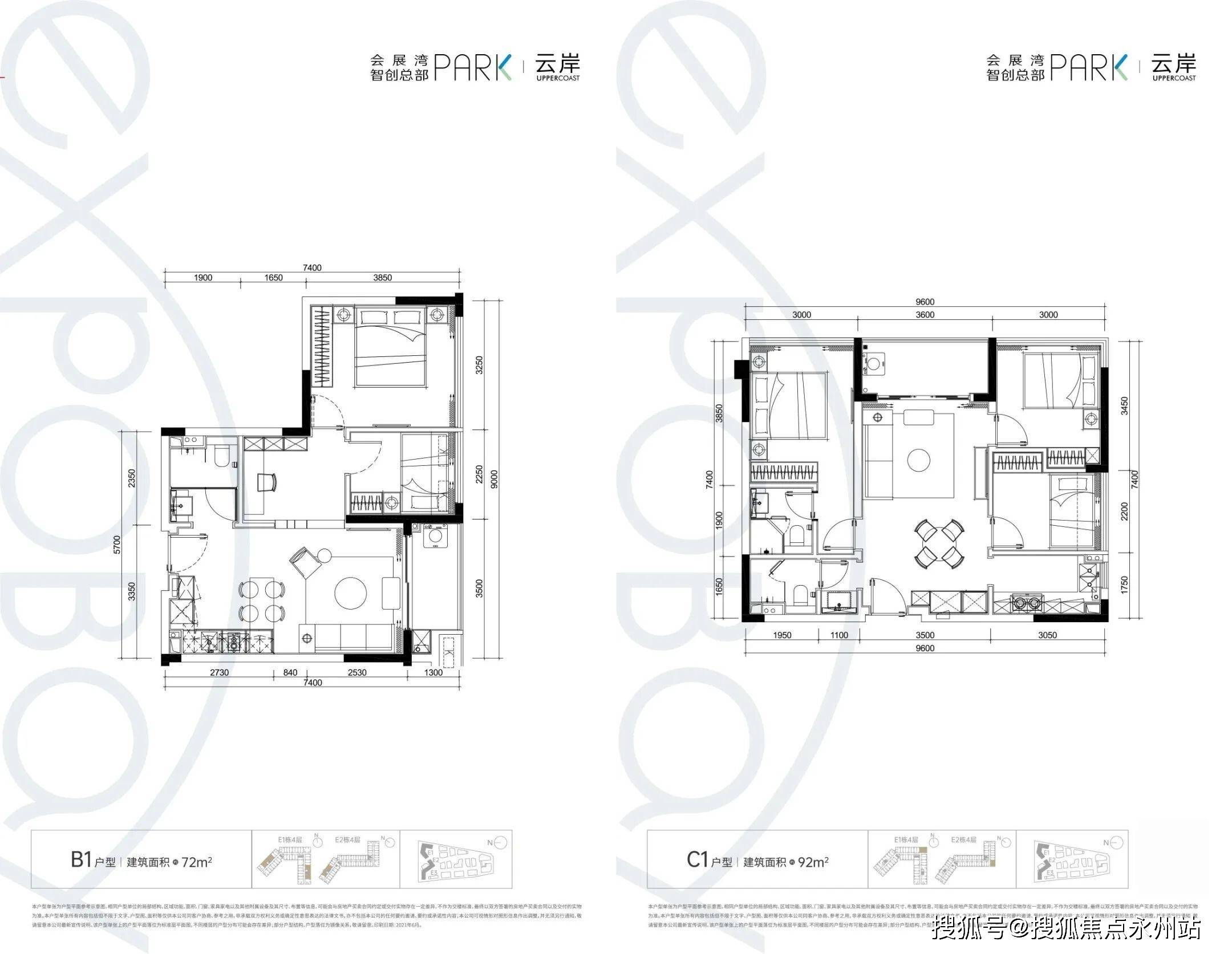 C1户型(92㎡)三房两厅两卫,正南朝向,端头位设计,双面采光,主客分区明确,部分户型可瞰河景。
