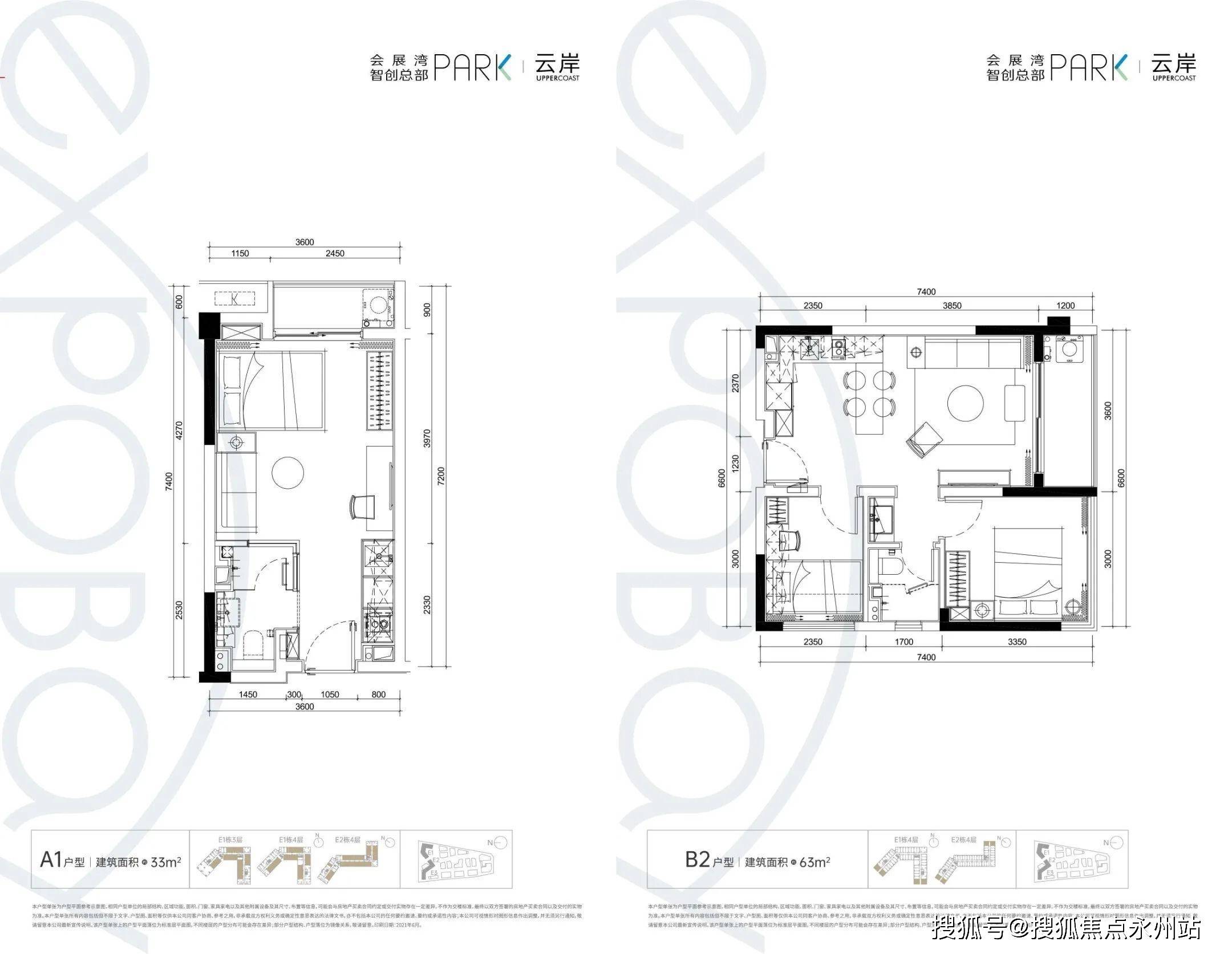 B2户型(63㎡)两房一厅一卫,西南、东南朝向,端头位设计实现双面采光,享有无敌景观。