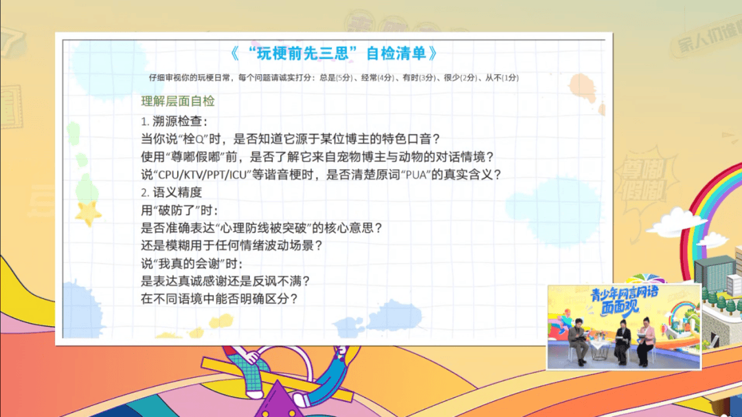 本期节目通过多元视角辩论热梗使用过程中的利弊。结合校家社协同育人理念,形成可落地可操作的引导方法,助力青少年提高语言文化素养,养成健康、规范、文明的网络用语习惯。